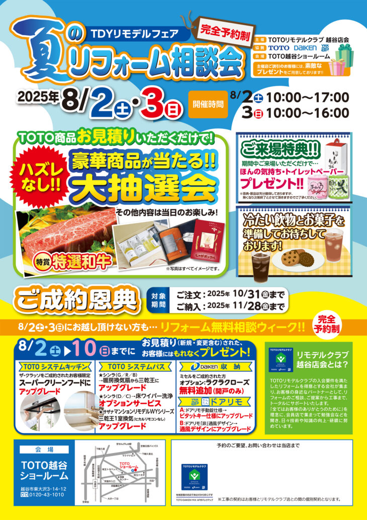 - TOTOリモデルクラブ越谷店で夏のリフォーム相談会を開催!完全ご予約制となっておりますので、この機会に是非ご参加下さい!