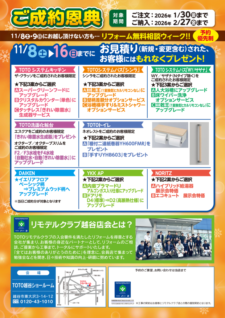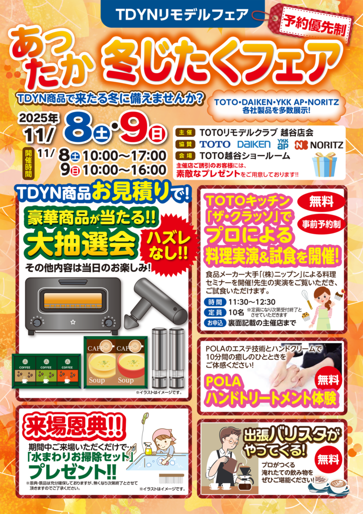 会場 TOTO越谷ショールーム 会場住所 越谷市東大沢3-14-12 開催日時 2025年11月8日(土)10:00~17:00 9日(日) 10:00~16:00 一言 TDYN商品で来る冬に備えませんか?