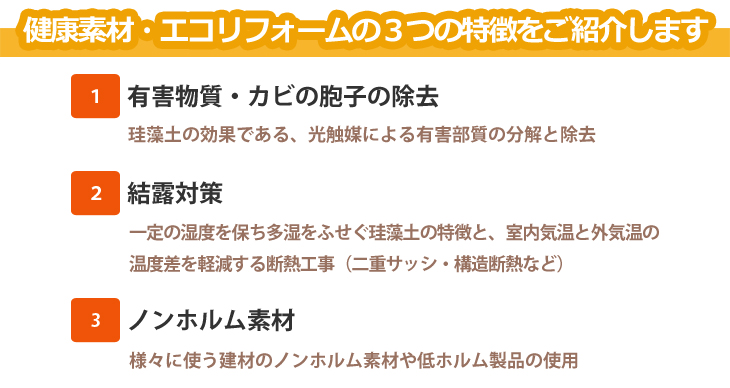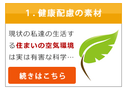 イベント・ リフォーム価格表 無料見積り・相談 電話で見積り・相談 048-734-1577 【受付】9:00~18:00【定休日】年中無休(GW・お盆・正月除く) 電話で見積り・相談 HOMEサンビックのエコリフォーム ①~10年20年先も、家族の健康を守る住まいに~ サンビックのエコリフォーム ①~10年20年先も、家族の健康を守る住まいに~ 『10年20年先も一生お付き合いいただける会社でありたい』との想いからサンビックでは『家族の幸せと健康を守るエコリフォーム』をご提案しています。 そのエコリフォームの3つのコンセプトがこちらです。 このエコリフォームの骨格となる『自然素材・珪藻土』を中心とした、3つのコンセプトを下記でご紹介いたします。 皆さんは『家族の健康の為にできることは?』と質問されたら、パッと思いつく事は何ですか? 私はすぐに『食品や飲み物。特に水に気を使うなぁ』と思いました。 皆さんはいかがですか? 安心・安全で身体に良い食品・お水は健康の為には欠かせないことだと思います。 しかし、もっと健康の為に欠かせないことがあります。それは空気です。 人が一日に食料を摂取するのは約2kgだとすると、空気の一日の摂取量はなんと10倍の20kgだそうです!(私はこの話を聞いて正直ビックリしました!) この事は住まいの空気環境が重要であり健康に欠かせない事ということなのです。 しかし現状の私達の生活する住まいの空気環境は、壁紙・床材・構造材等の建築材料や家具などからホルムアルデヒドなど有害な化学物質が放散され室内に充満しているのです。 私自身もカビや化学物質が原因で幼い頃からアトピー性皮膚炎に悩んだ経験があり、毎日の生活空間の空気と健康の重要性を身にしみて感じています。 珪藻土で健康な空気へリフォーム ~ 本物の珪藻土 ~ 私自身の経験からもお客様にご提供するサンビックのエコリフォームは単なる改装だけではなく、目に見えない『有害な化学物質』や『カビの胞子』の除去や『カビの原因である結露』を防ぎ、いわば空気さえもリフォームすることで『家族の健康を守る健やかな空気の住まい』へと生まれ変わるのです!そのエコリフォームの骨格となるのが珪藻土壁材『エコ・クィーン』です。珪藻土といっても多くのメーカーから販売されていますが、サンビックの珪藻土はより効果の高い珪藻土壁材『エコ・クィーン』を使っています。ほんの一部ですが、『健やかで綺麗な空気』を作るエコリフォームの内容を紹介します。 その他にも様々な施工方法がありますが、お客様のお宅の現状に合わせたエコリフォームをご提案していますので、詳しくはお問い合わせください。 会社案内 会社案内ご挨拶会社概要企業理念スタジオ紹介 お客様へのお約束 スタッフ紹介 施工事例 施工事例一覧 サッシ工事 インナーサッシ工事 珪藻土 断熱工事 ネオマ断熱ボード貼 結露対策断熱工事 キッチン 浴室 洗面化粧台 トイレ 内装 省エネリノベーション お客様の声 お客様の声一覧 お役立ち情報 トイレ TOTO ピュアレストQR ウォシュレットBV2 ¥148,500~(税込) キッチン クリナップ ラクエラ ¥700,700~(税込) 浴室 TOTO サザナ 1216サイズ ¥818,400~(税込) チラシ・イベント リフォーム価格表 リフォームの流れ よくある質問 住宅省エネ2025キャンペーン 先進的窓リノベ2025事業 子育てグリーン住宅支援事業 給湯省エネ2025事業 お問い合わせ お問い合わせ お見積もり TOP 私たちについて 会社案内ご挨拶会社概要企業理念スタジオ紹介 お客様へのお約束スタッフ紹介 施工事例 施工事例一覧 サッシ工事 インナーサッシ工事 珪藻土 断熱工事 ネオマ断熱ボード貼 結露対策断熱工事 キッチン 浴室 洗面化粧台 トイレ 内装 省エネリノベーション お客様の声 お客様の声一覧 お役立ち情報 チラシ・イベントリフォーム価格表リフォームの流れよくある質問住宅省エネ2025キャンペーン先進的窓リノベ2025事業子育てグリーン住宅支援事業給湯省エネ2025事業 お問い合わせ お見積もり © 2018 株式会社 サンビック埼玉県春日部市大場751-6 TEL:048-734-1577 FAX:048-738-2646