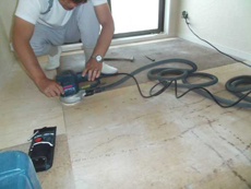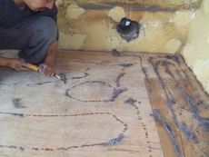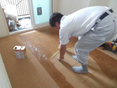 コルク施工の様子です。床をフラットにする為凹凸を専用工具で削っていきます。