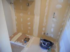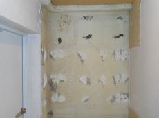 洗面所クロス張替えの下時作業中。