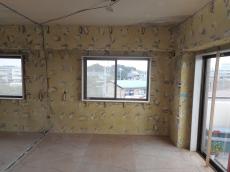 洋室2 断熱工事の前に、下地を固定する為の木レンガを打ち付けていきます。