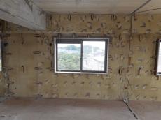 リビング 壁が黄色く見えるのは既存の断熱材です。この上から新規に断熱材を吹き付けていきます。