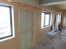 壁を解体したのでリビング~洋室1~洋室2までが1つになりました。手前から1つ目と2つ目の窓の間に物入れを造作します。また、風通し用の通路も作ります。