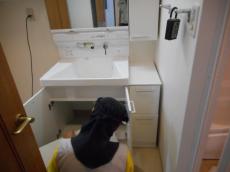 内装工事終了後に洗面台取付作業。